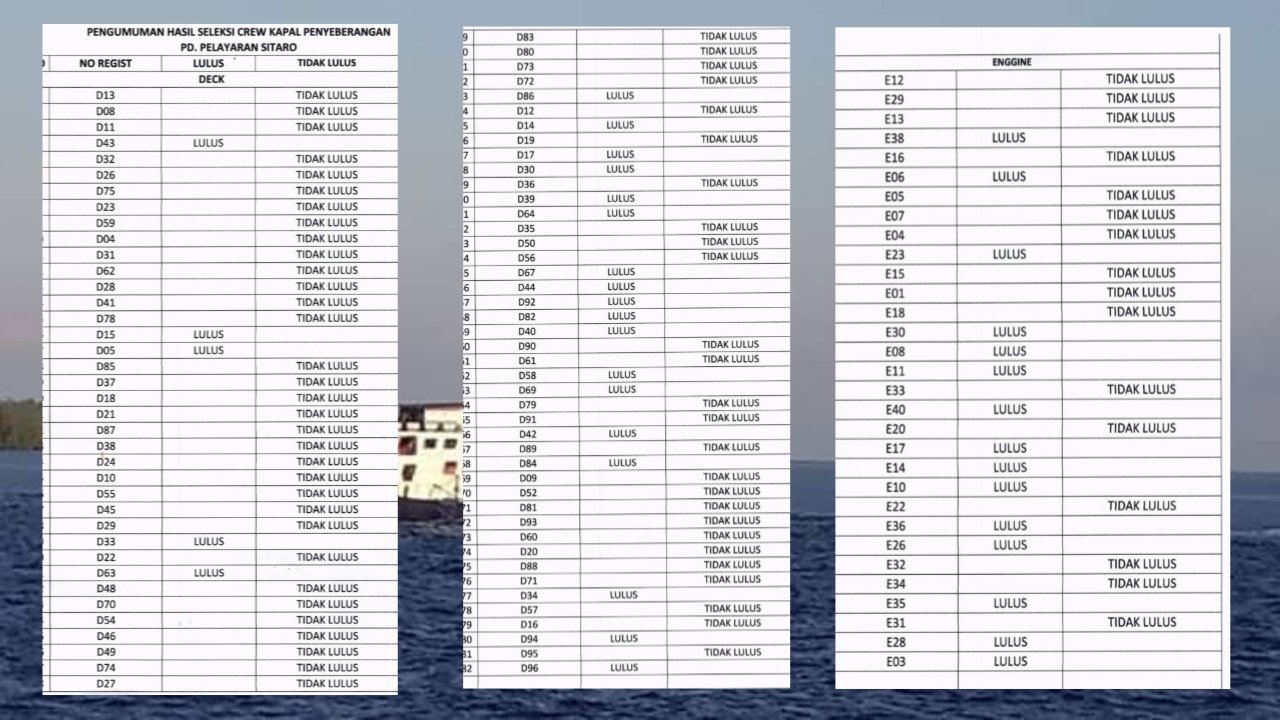 Ini nama-nama calon crew kapal yang dinyatakan lulus assesmen berdasarkan nomor register pendaftaran peserta: